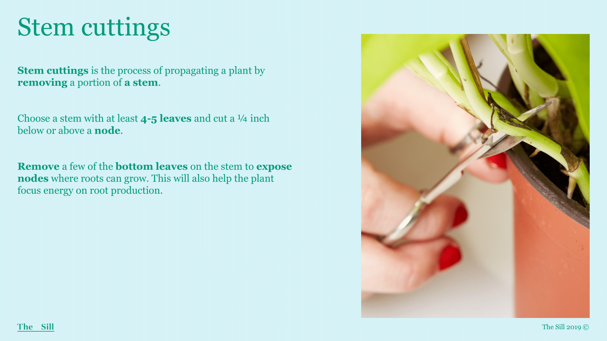Examples of plants that can be propagated using stem cuttings include Pothos, Philodendron, Monstera, Dracaena, ZZ plants, Aglaonema, Maranta, Hoyas, Schefflera, Peperomia, Pilea, etc.