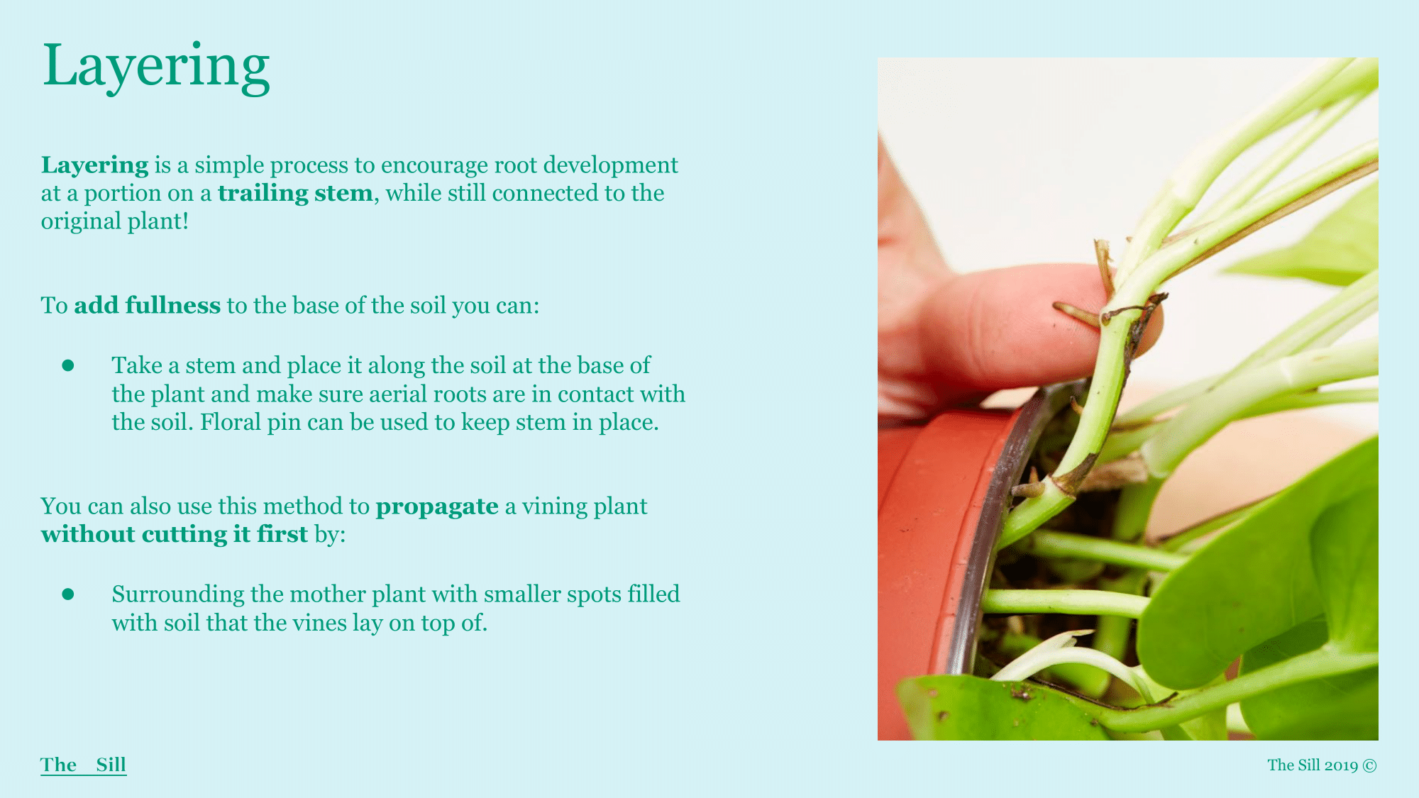 - Layering before cutting: before cutting a plant to propagate with this method, you can surround the mother plant with smaller pots filled with soil, and have the trailing stems be in contact with the soil in the smaller pots below. Overtime, the vines should root themselves into the potting mix where you can then cut the vines from the main plant and then treat as an adult plant. The soil can be pre-moistened prior, but you shouldn’t have to re-water until roots start to develop.
