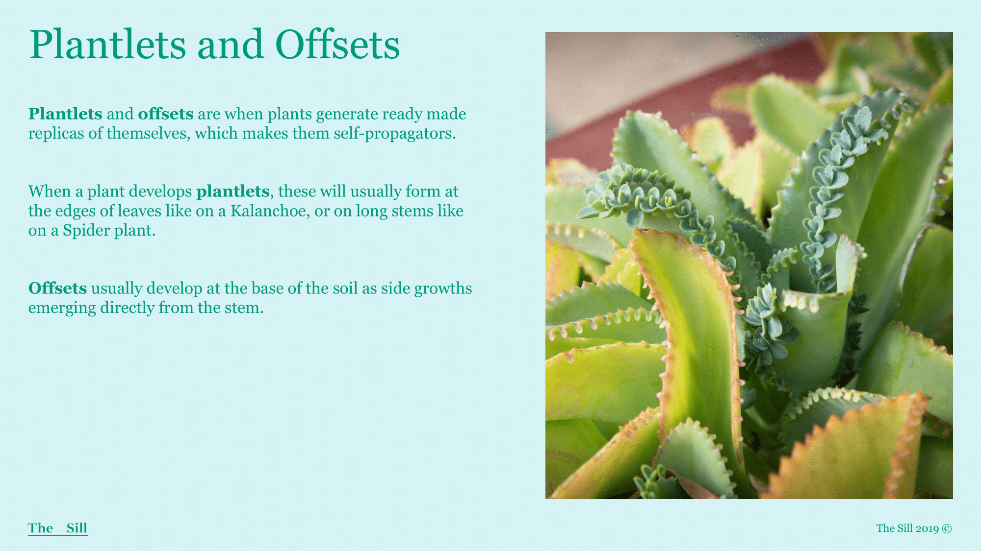 - Examples of plants that develop offsets at the soil include Aloe vera, Haworthia, Bromeliads, Orchids.