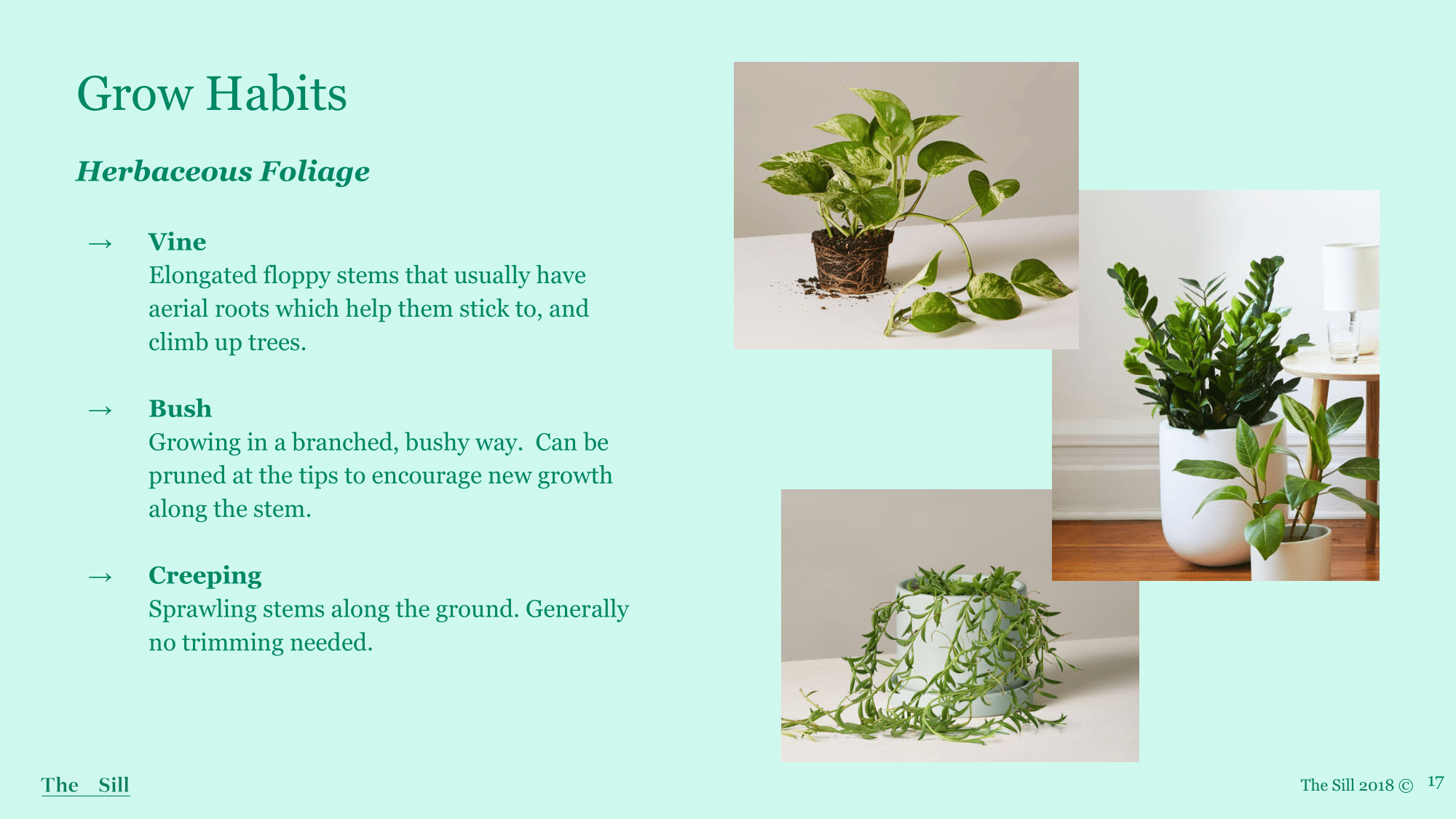 - Creeping - Can prune, however, to take cuttings. Creeping plants can be trained to vine down in a hanging planter, or they can “creep” along the soil.