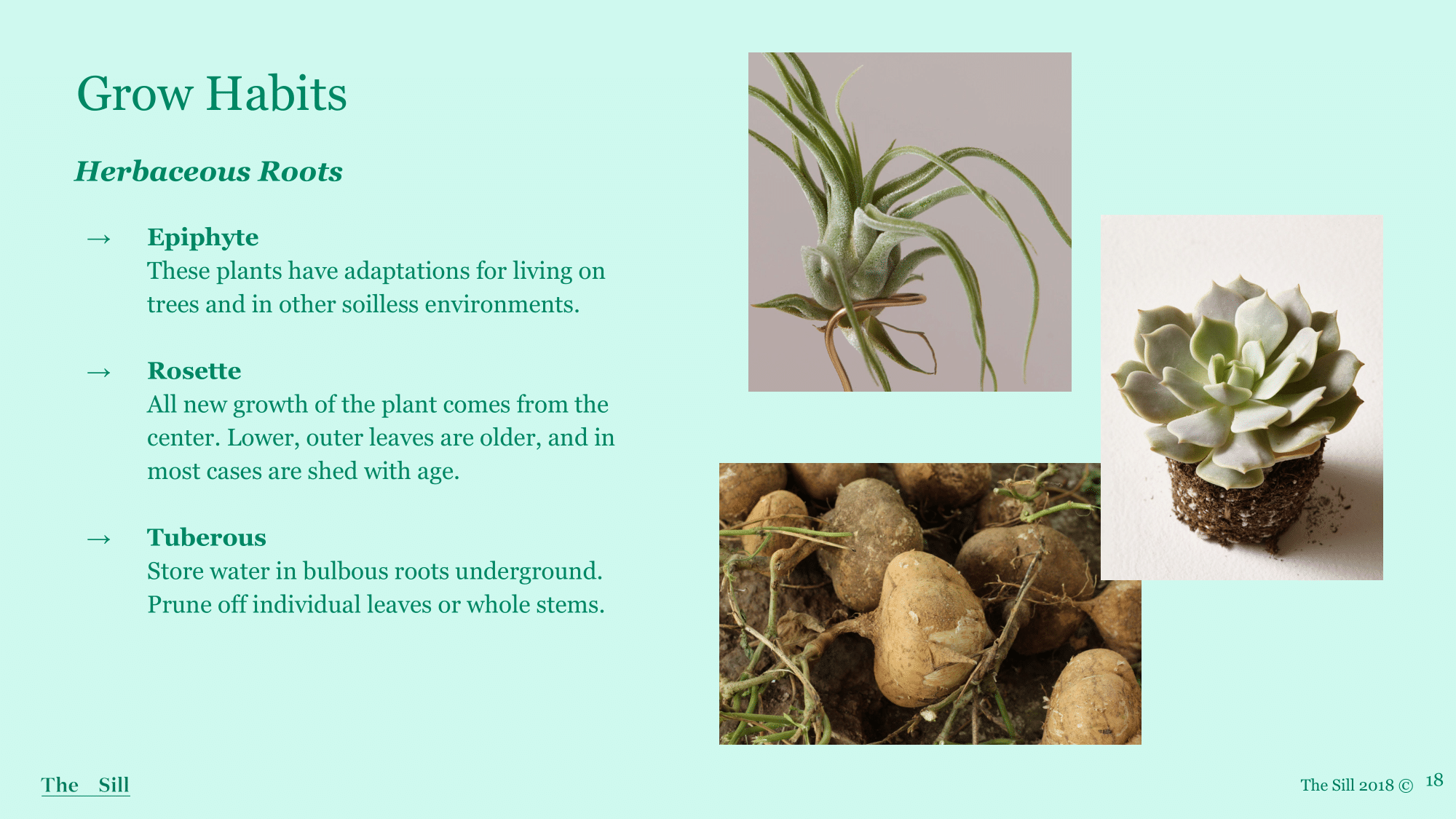 Examples: epiphytes include air plants, bromeliads, stag/birds fern, and even Aroid species that are semi-epiphytic. Rosette can include Echeveria, haworthia, agave, aloe. Tuberous can include ZZ plants, Calathea, and Alocasia.