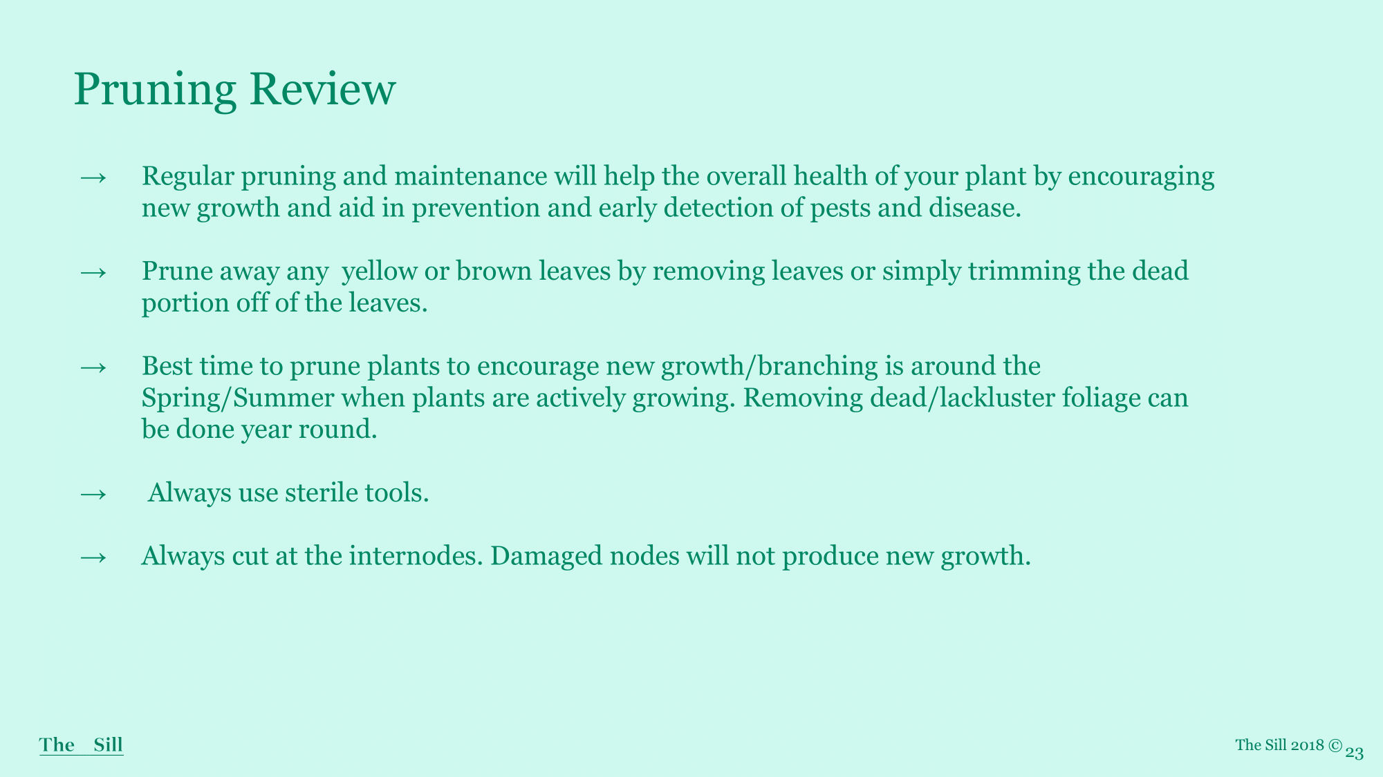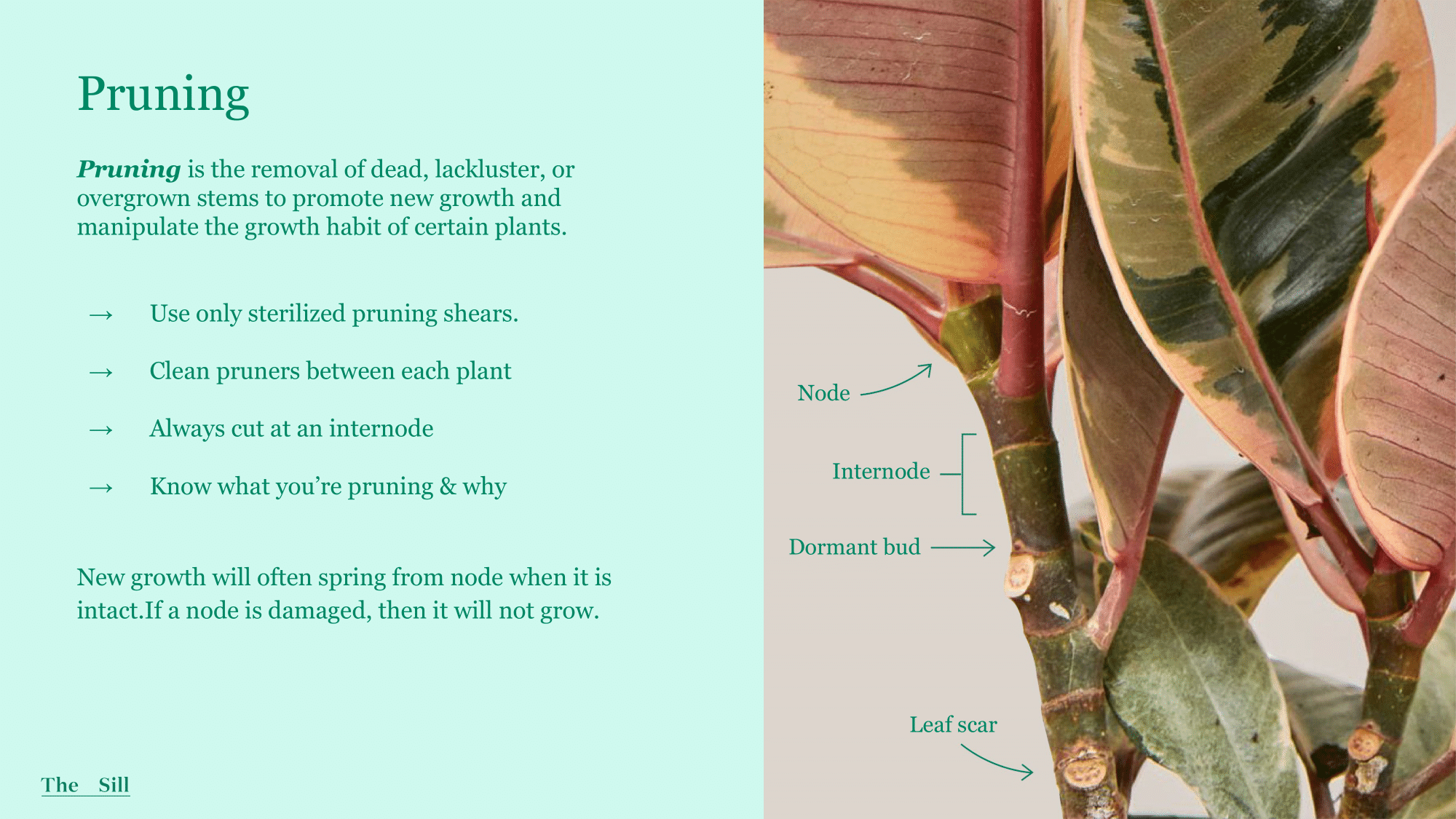 Know what you’re pruning:While pruning can be done to remove dead foliage, it’s not necessary for all plants to encourage growth or even branching depending on growth habit. Plants that wouldn’t produce lateral growth from pruning include Snake plants, ZZ, Peace lilies, Calatheas, Spider plants, Bromeliads, BNF, etc.
