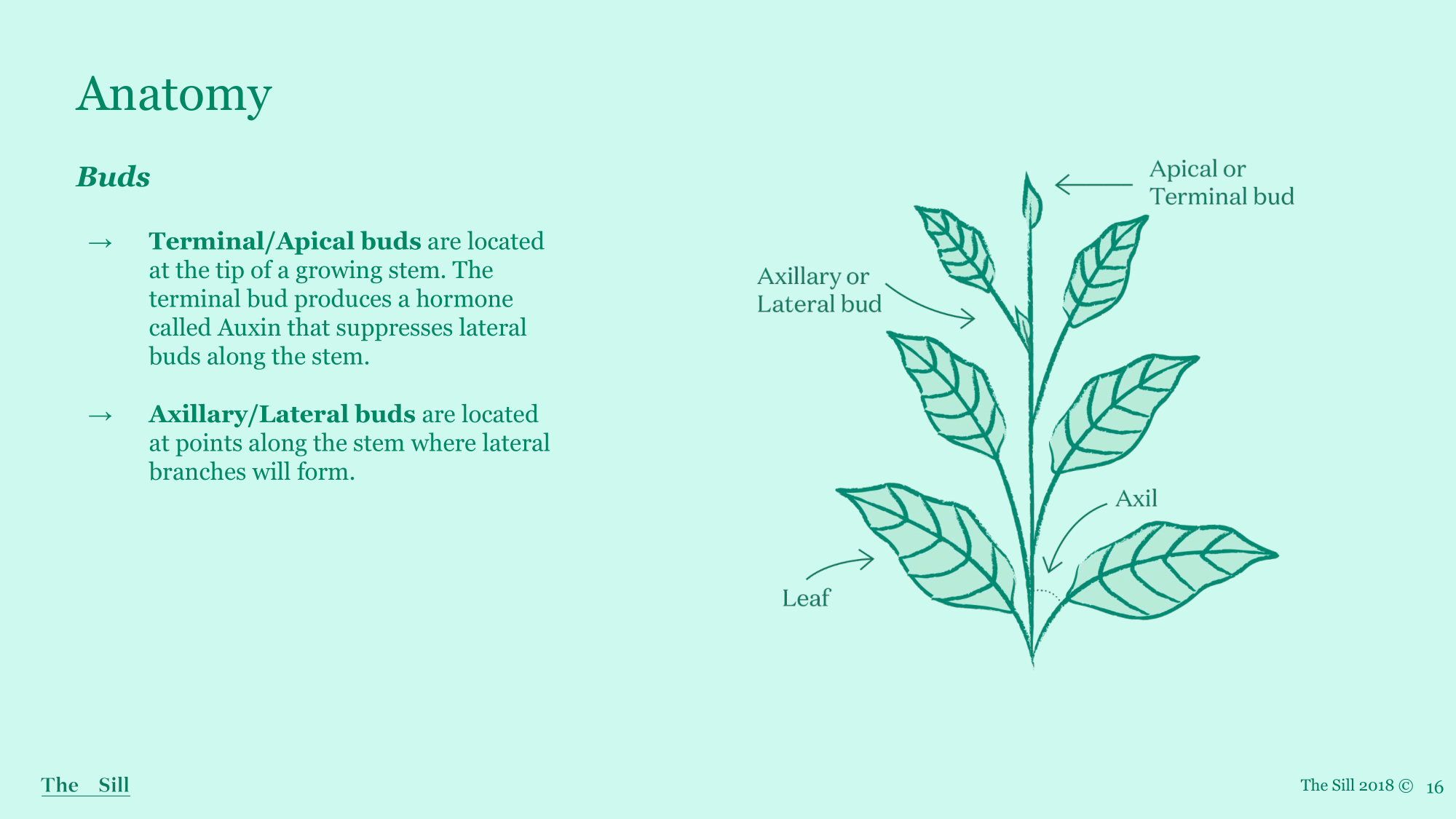 - Terminal/Apical bud - If removed it will encourage lateral dormant buds to form beneath the cut. This helps plants that have apical dominance (those that continuously grow upwards, like Ficus) to branch out and become bushier plants.