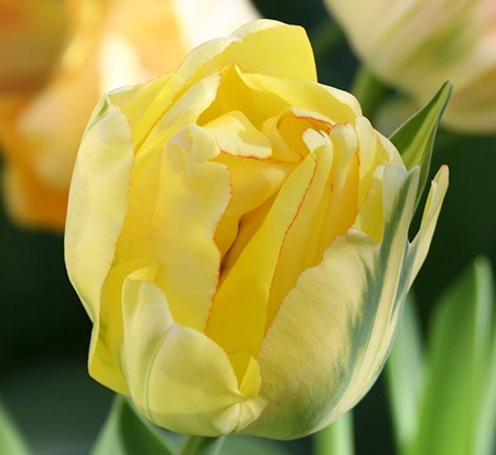 Bring radiance and warmth to your garden with the Akebono Tulip. This unique variety features a creamy yellow bloom with frilly, golden edges and a soft stroke of pink-red at the tips. It’s a showstopper for any spring garden!