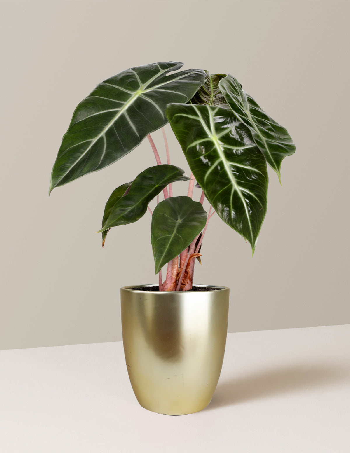 Alocasia Pink Princess pairs vibrant stems with dramatic foliage—this tropical plant thrives in bright light and adds color, texture, and movement to any space.