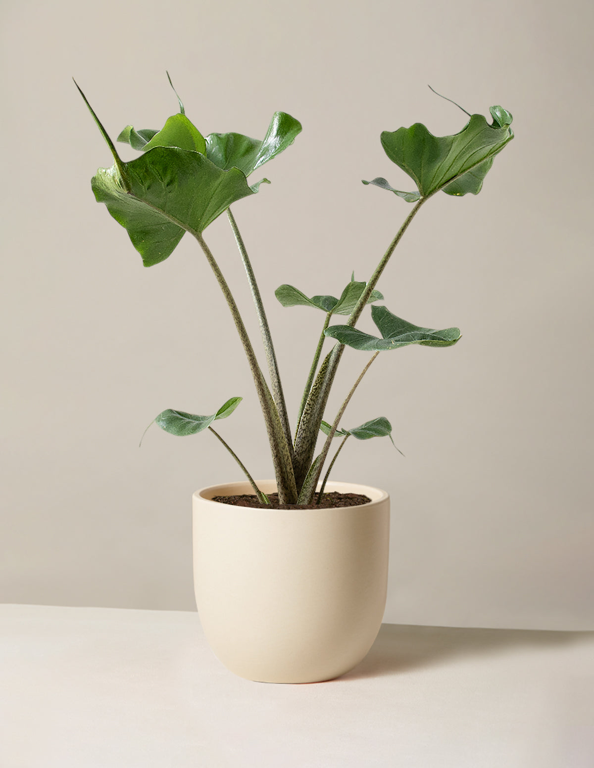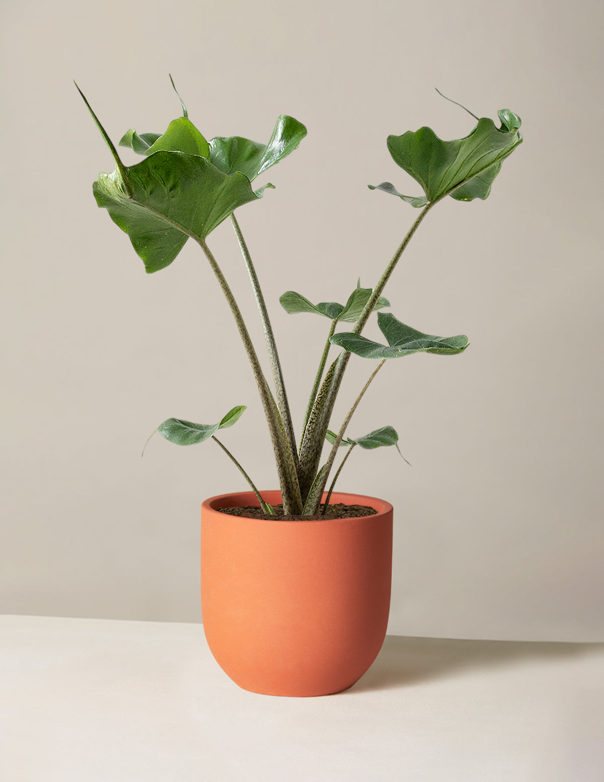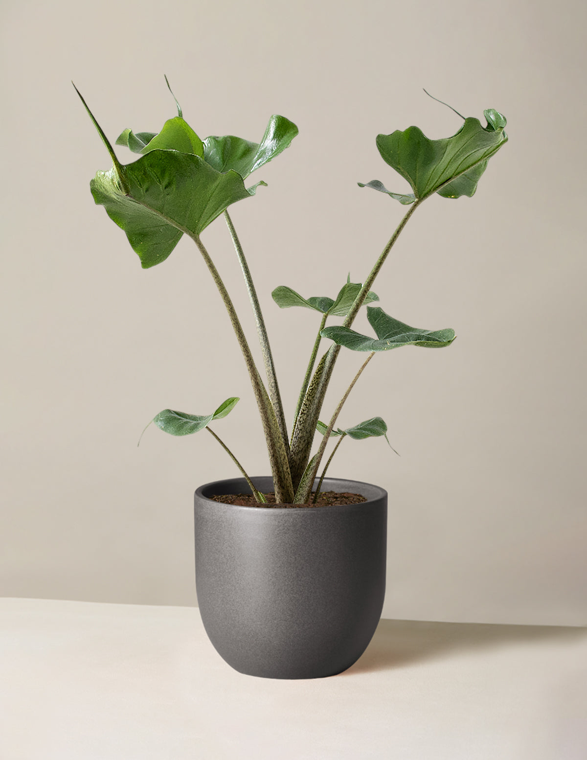 The Alocasia 'Stingray' gets its name from its uniquely shaped leaves that resemble the wings and tail of a stingray! Its vibrant green foliage with prominent veining and speckled stems is perfect for enthusiasts seeking a bold addition to their collection. Perfect for plant enthusiasts, this Alocasia thrives in bright, indirect light and enjoys high humidity.