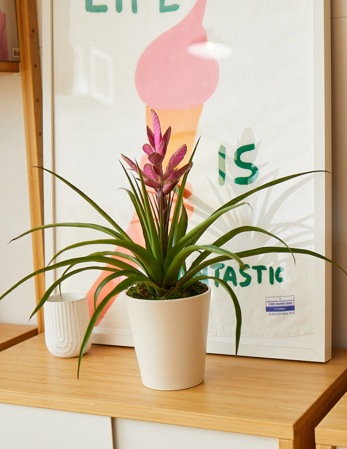 With striking pink blooms and lush foliage, this Bromeliad thrives indoors with minimal care and makes a colorful accent for desks or shelves.