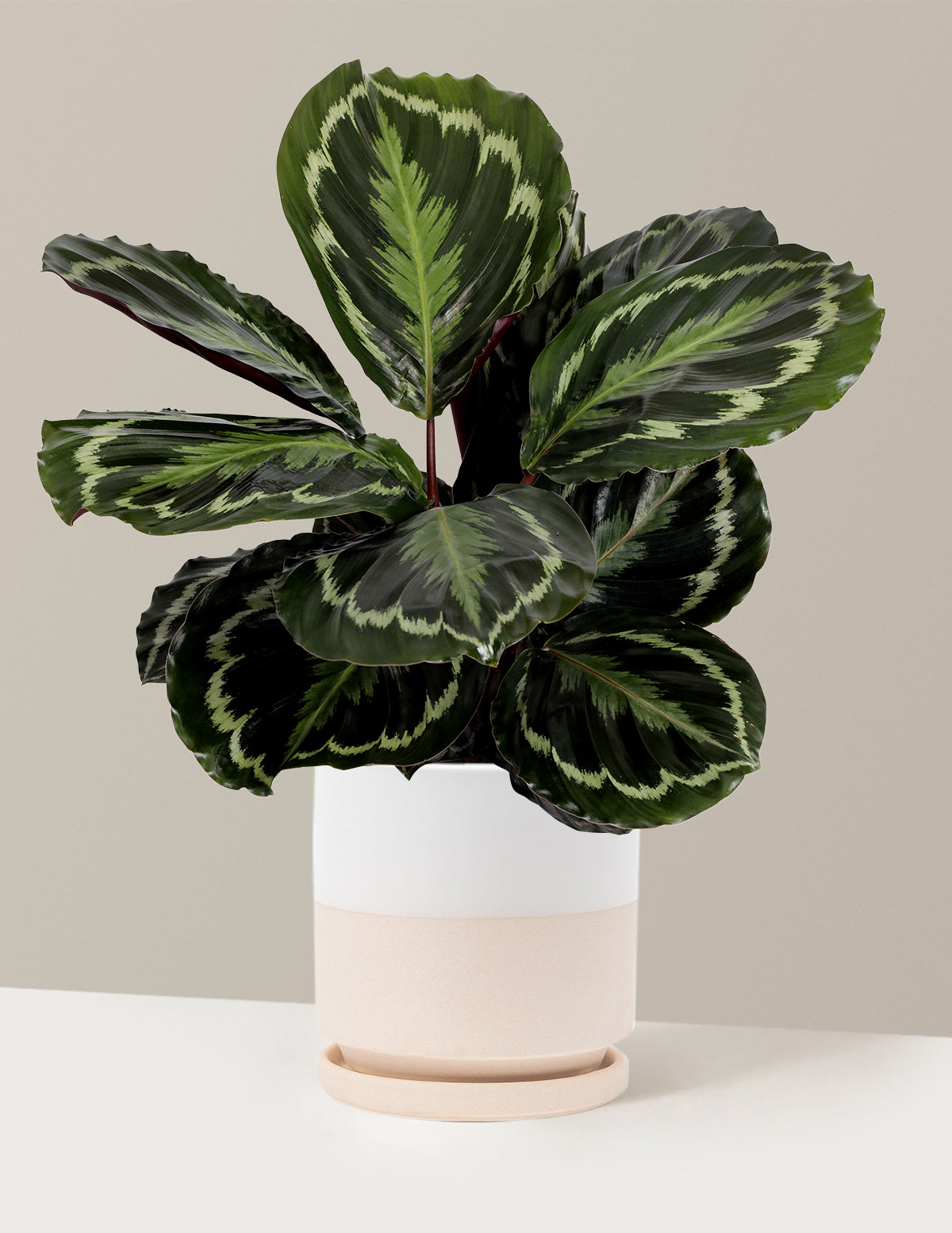With striking green-and-purple leaves that open and close daily, the Calathea Medallion is a pet-safe, easy-care plant that livens up low-light spaces