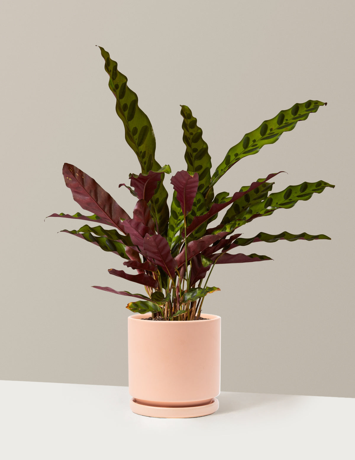 The Calathea Rattlesnake is known for its long, wavy green leaves with a brushstroke pattern resembling reptile skin. It raises and lowers these leaves from day to night, a phenomenon called nyctinasty and the source behind its nickname prayer plant. This plant is pet-friendly!