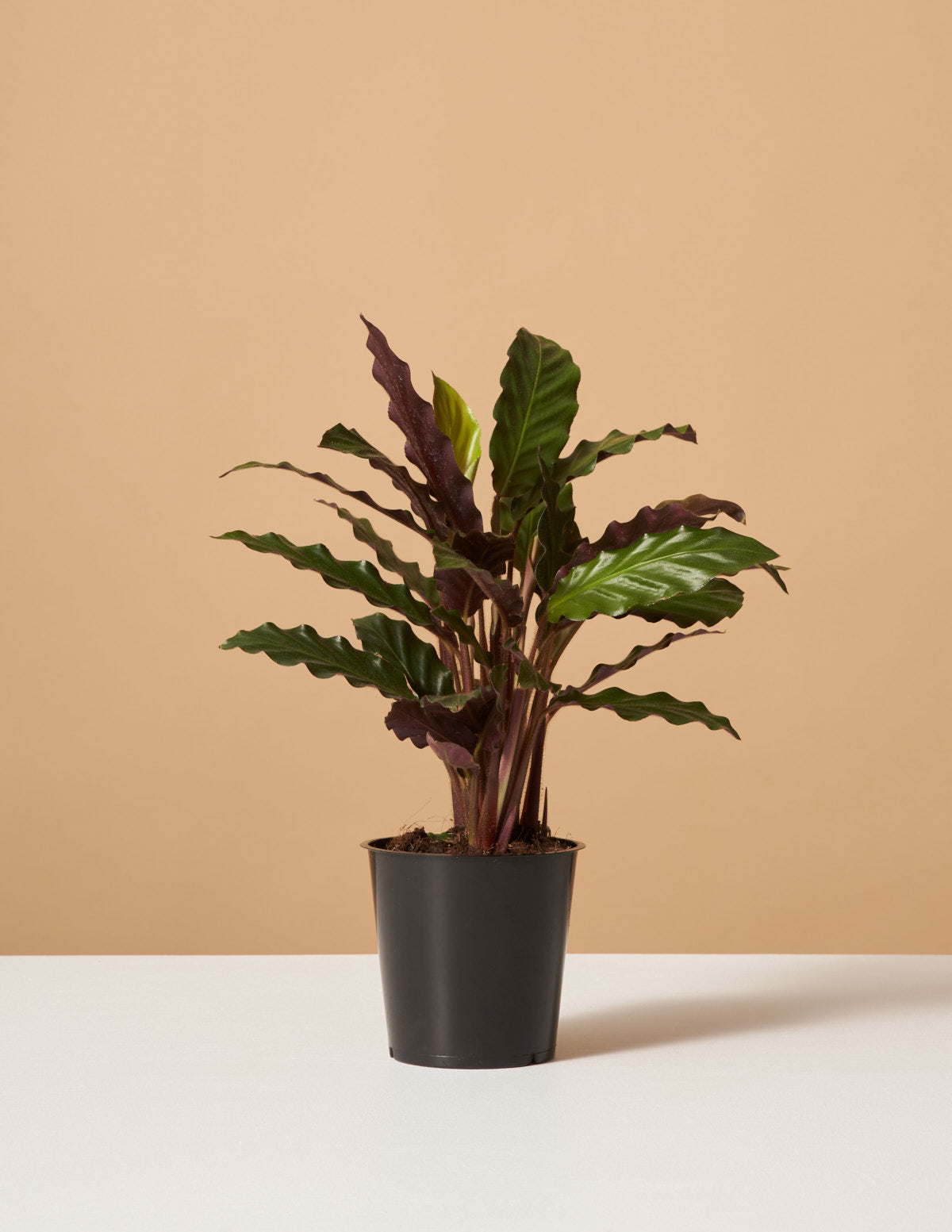 Calathea Wavestar is a subtle species in the prayer plant family with green foliage and fuzzy maroon undersides. This prayer plant gets its name due to its slender, wavy leaves with ruffled edges that can grow up to 3 feet in height.
