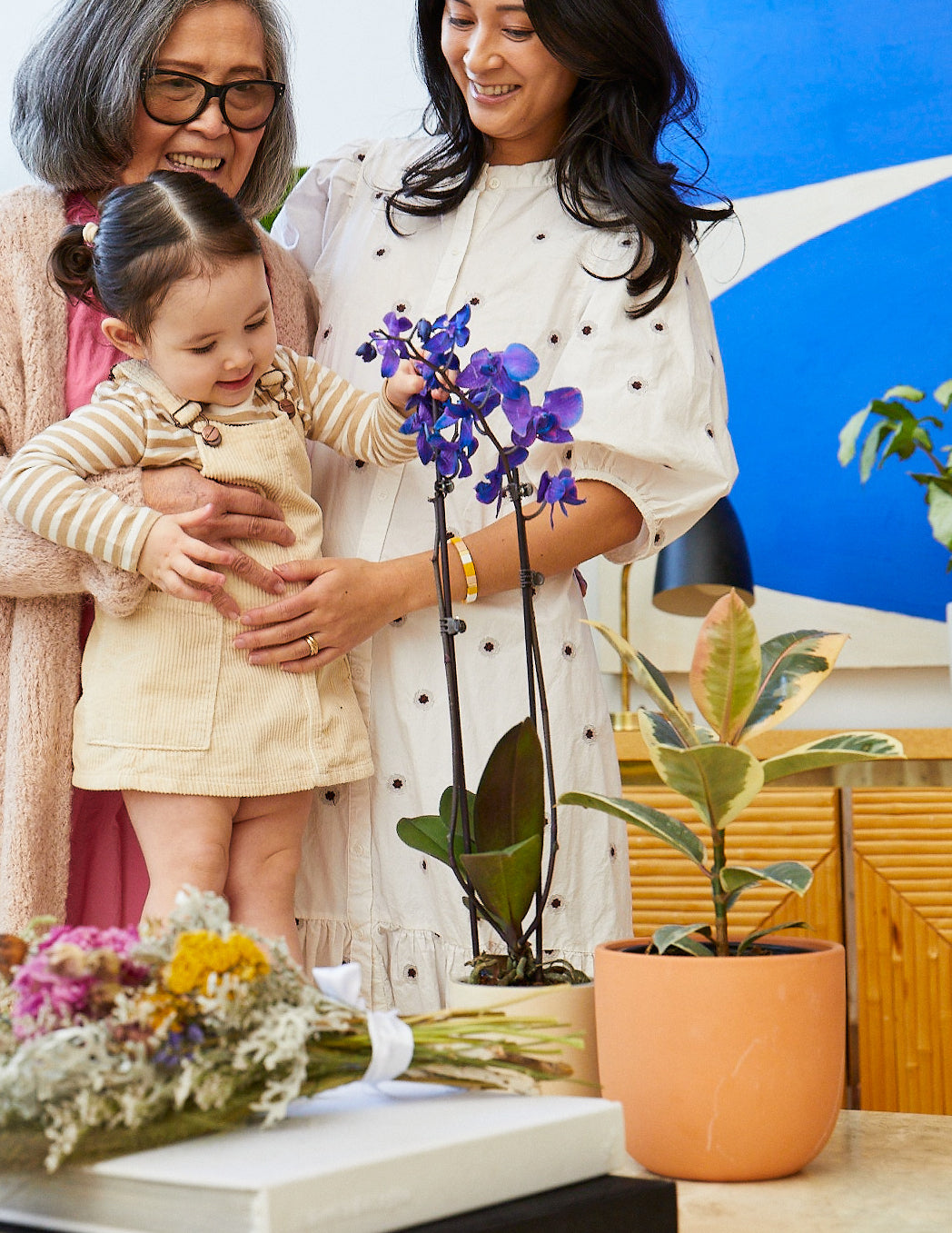 The Dark Purple Watercolor Orchid achieves its look through a special process in which dye is injected into the stem, giving the petals their bright, gradient coloring. The dye is completely safe and causes no harm, though please note that when this plant re-blooms, it’ll be its natural color (white or light pink). This is a Phalaenopsis orchid, which typically blooms about once a year for up to three months. Non-toxic to pets.