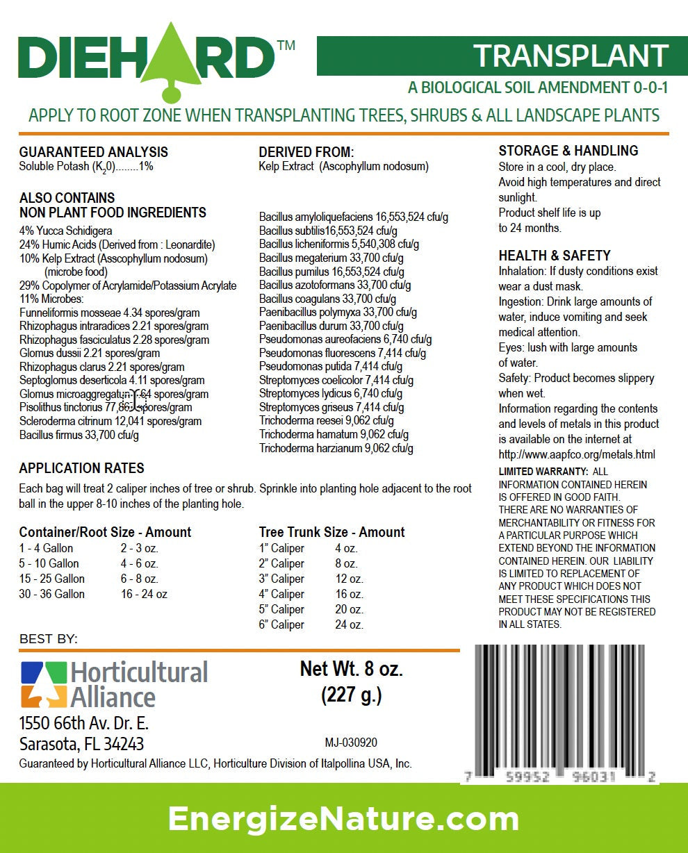 DIEHARD™ Transplant is a special soil amendment designed to help landscape plants establish quickly and healthily after planting. It boosts the soil's microbe activity, which aids in faster root growth and reduces the stress plants typically experience when transplanted. For ongoing care, it's recommended to use BioRush® to maintain and enhance plant "greenness."