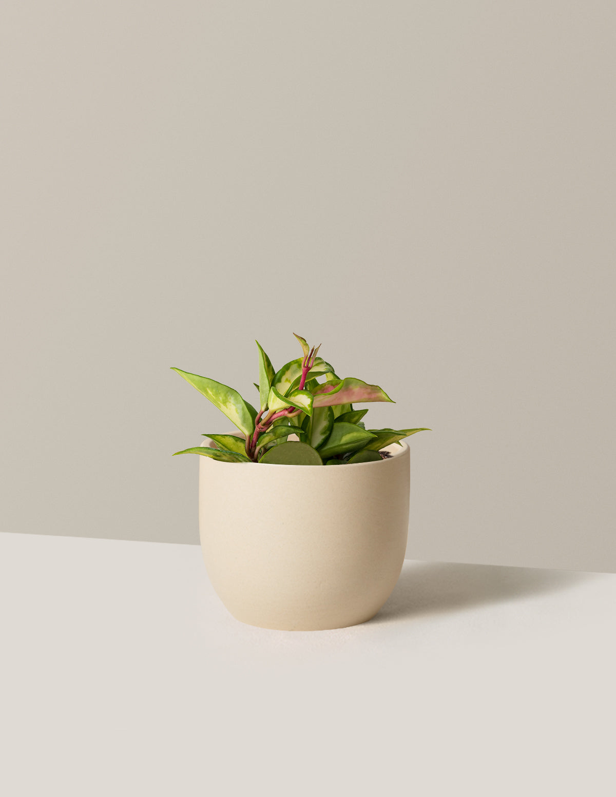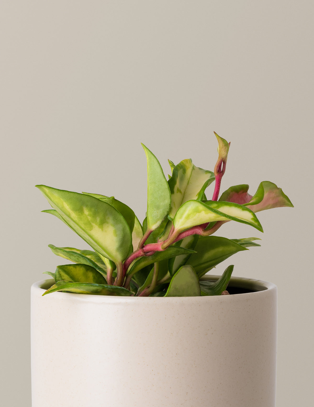 The Hoya carnosa variegata 'Tricolor' is an easy-going trailing plant with thick, waxy leaves (which is why they're sometimes also called "wax plants"). Vines of playful leaves with green, white and pink variegation will brighten up any room, and the plant may put out dainty, sweet-smelling flowers. Great for hanging baskets or anywhere with space for the vines to trail.