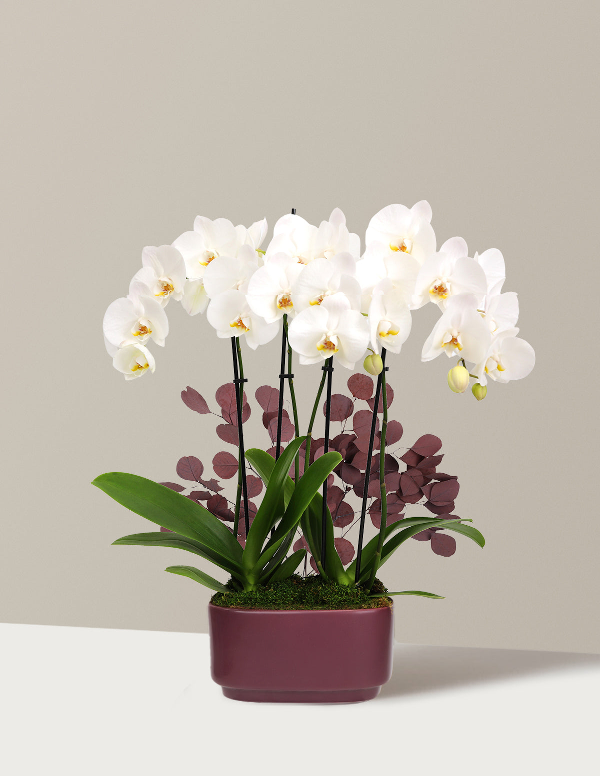 Our stunning Large Double Orchid features multiple orchid stems and the option to include fragrant, decorative eucalyptus (important note: eucalyptus is not pet-friendly) or fern foliage . This thoughtful gift is available in a variety of bloom colors, from white, purple, burnt orange, gold, and sky blue.