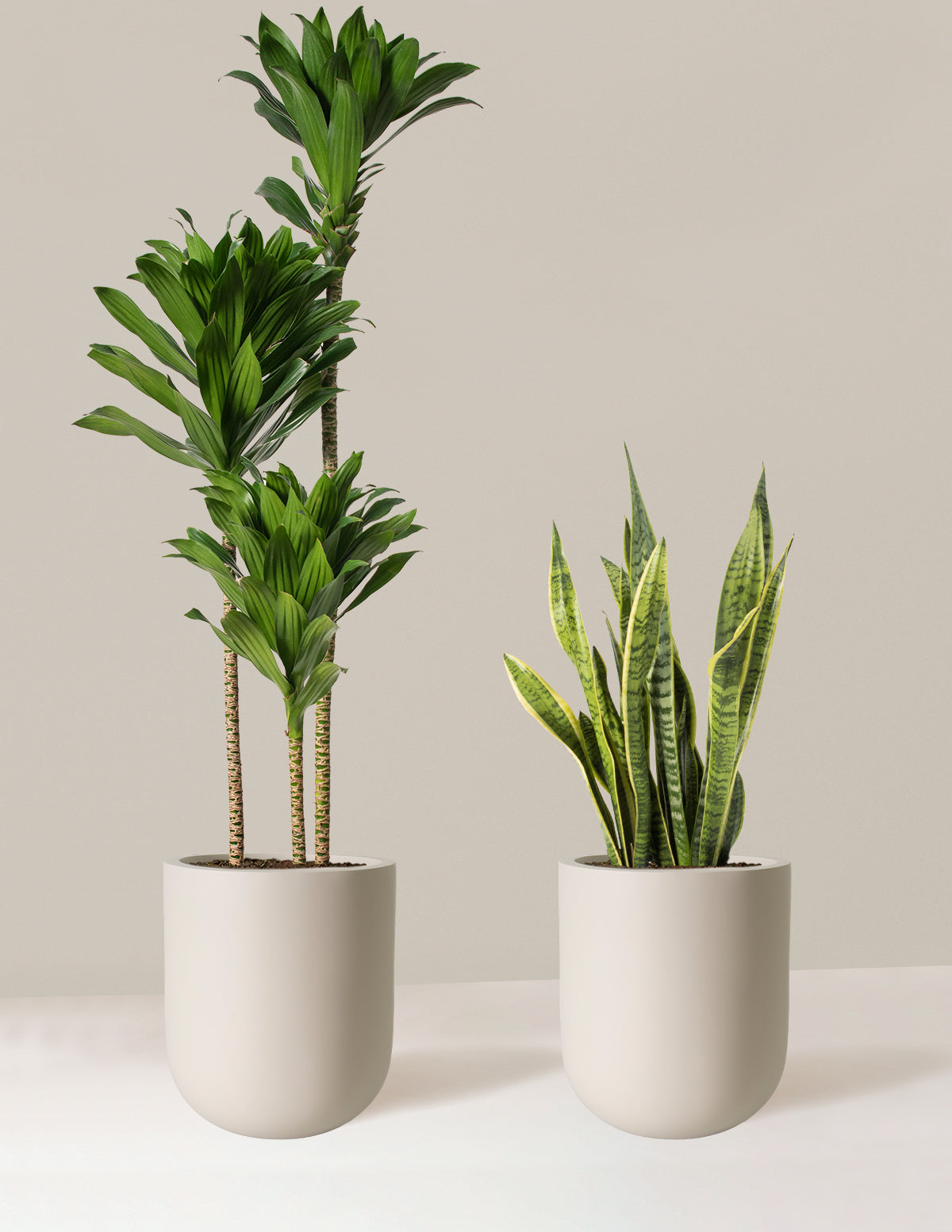 Enjoy two of our favorite versatile plants: the Snake plant and the Dracaena compacta, both of which are resilient and drought-tolerant. These easy-to-care for plants are adaptable to a variety of light conditions and are perfect for anyone looking for low-maintenance options for their home or office!