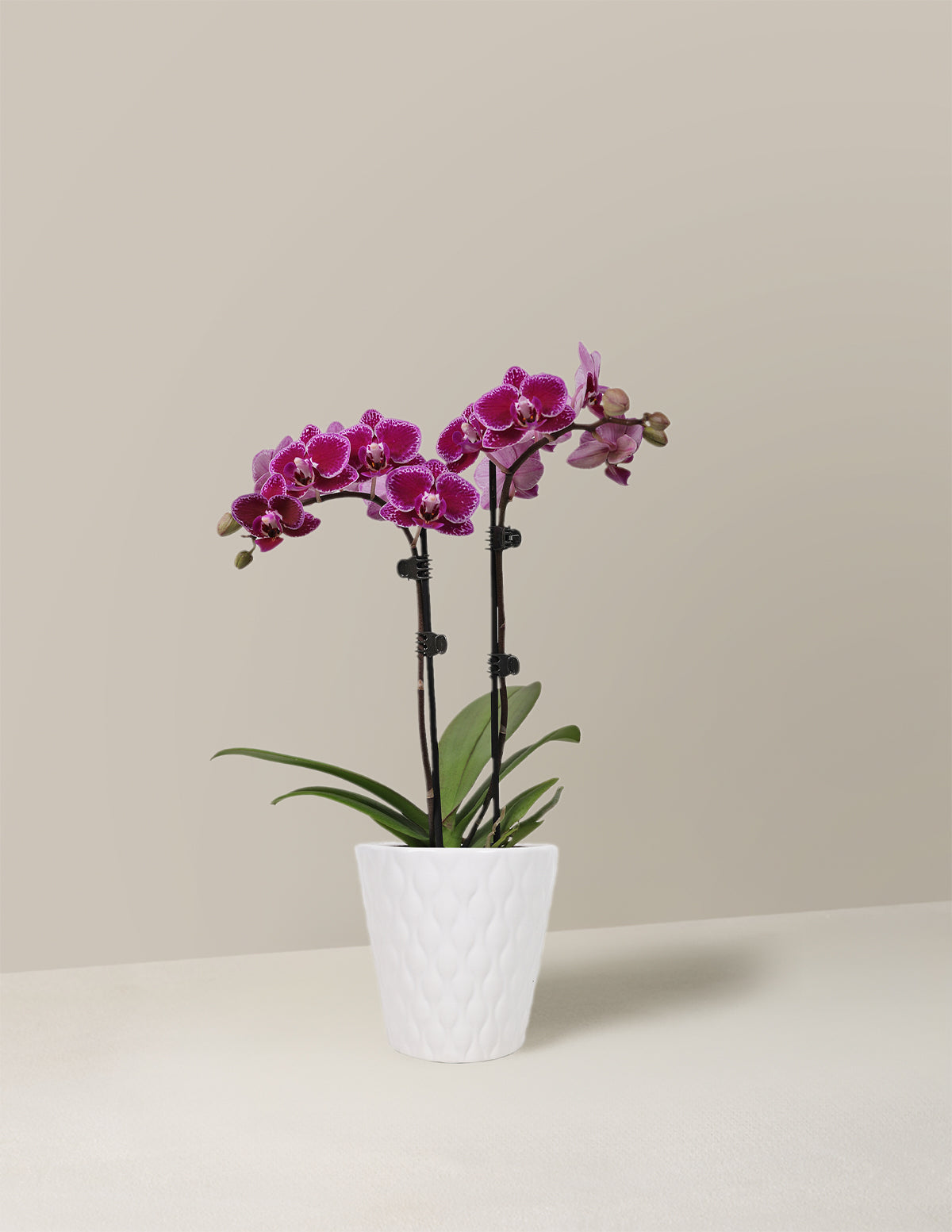 Add a pop of serenity to your tablescape with this popular, pint-sized Phalaenopsis orchid. This variety is affectionally called the "beginner orchid" because it's one of the easiest varieties to grow as a houseplant. You may notice a small number of blooms on your orchid upon delivery. These blooms will open quicker in a warm indoor setting. It will typically bloom about once a year, for up to three months. After a blooming cycle, the flowers will wilt and fall off. This is the orchid’s way to store up energy to re-bloom again next season.