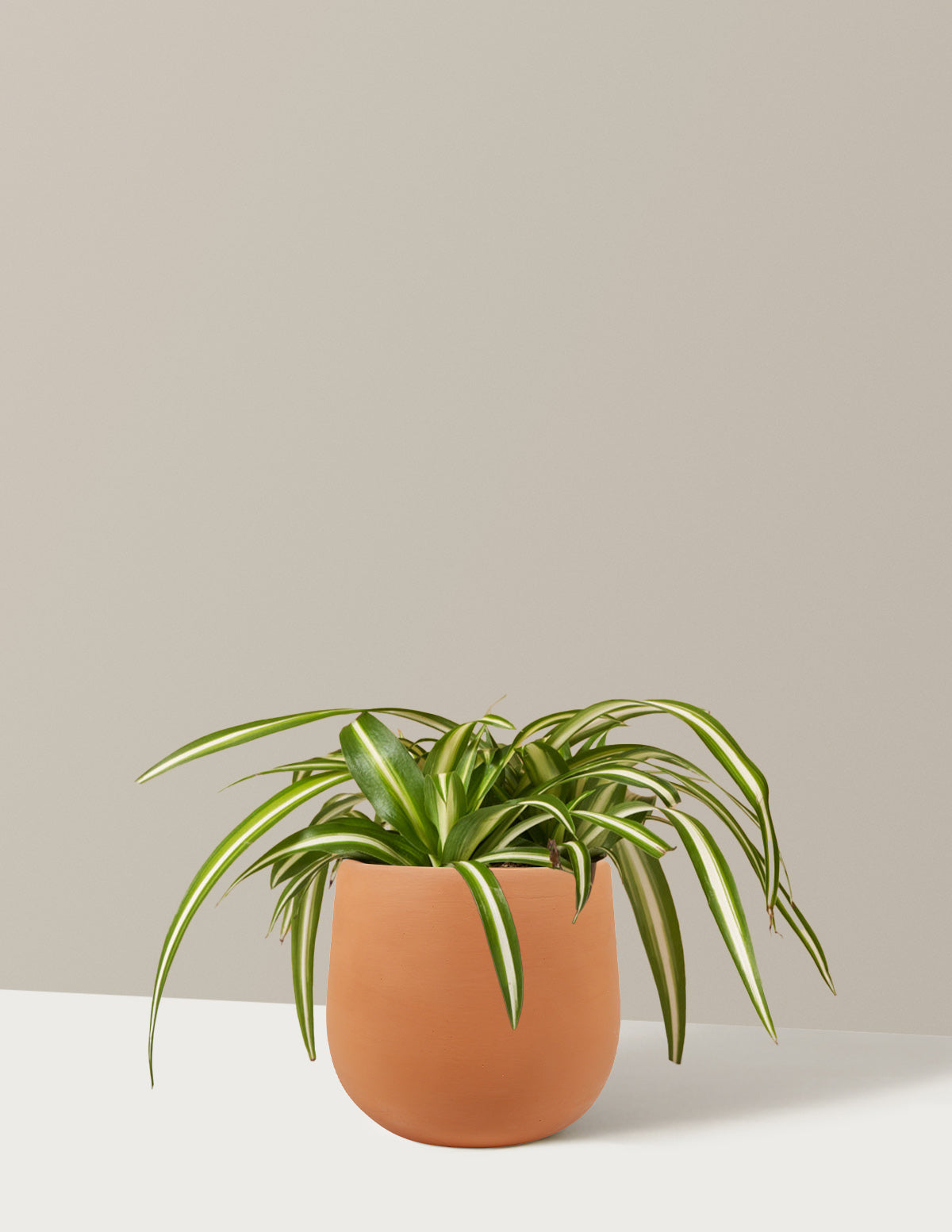 The Spider Plant’s easy-going nature and green and white striped foliage make it one of the most popular houseplants around. It gets its name from the baby plants, or spiderettes, that dangle down from a mature mother plant like spiders on a web. Despite its creepy-crawly name, the Spider Plant is a lush, easy-care pick perfect for bringing life to your space.