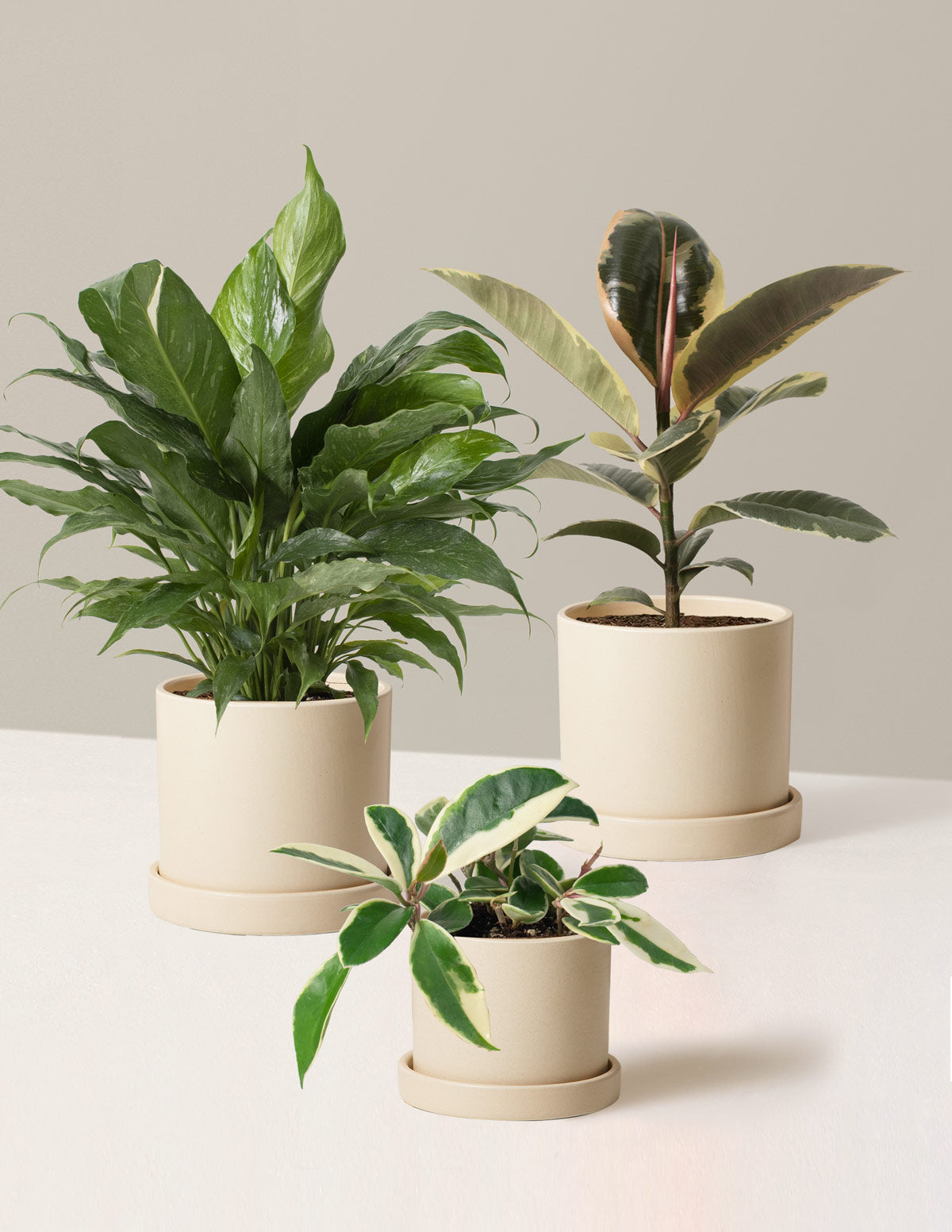 Our Spring bundle includes our medium Ficus Tineke, Peace Lily 'Domino' and small Hoya carnosa tricolor. These striking houseplants are low maintenance and have colors and textures that exude Spring vibes.