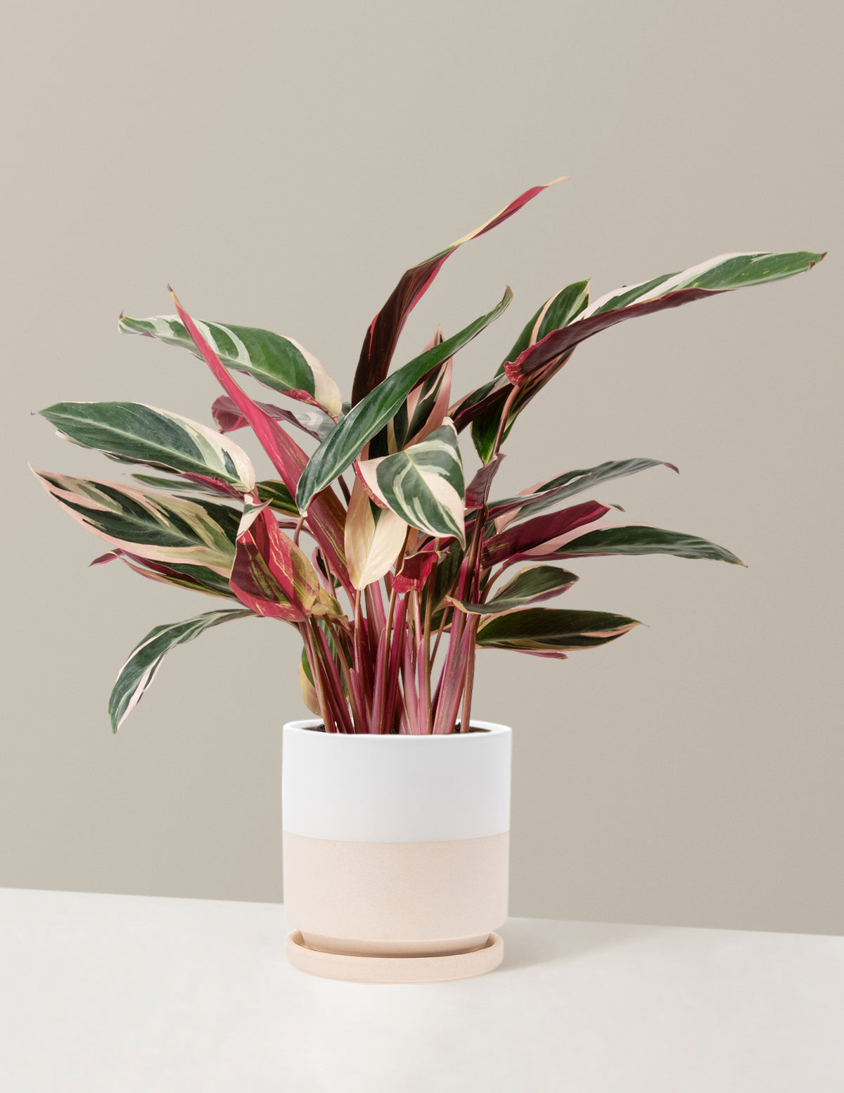 The elegant, elongated leaves of the Stromanthe Triostar are green, pink, and cream on top and magenta underneath. Help its variegation stay vibrant by placing it in a spot that receives bright indirect light. The Stromanthe is part of the same family as prayer plants (Marantaceae) and will similarly appreciate high humidity from a pebble tray or humidifier.