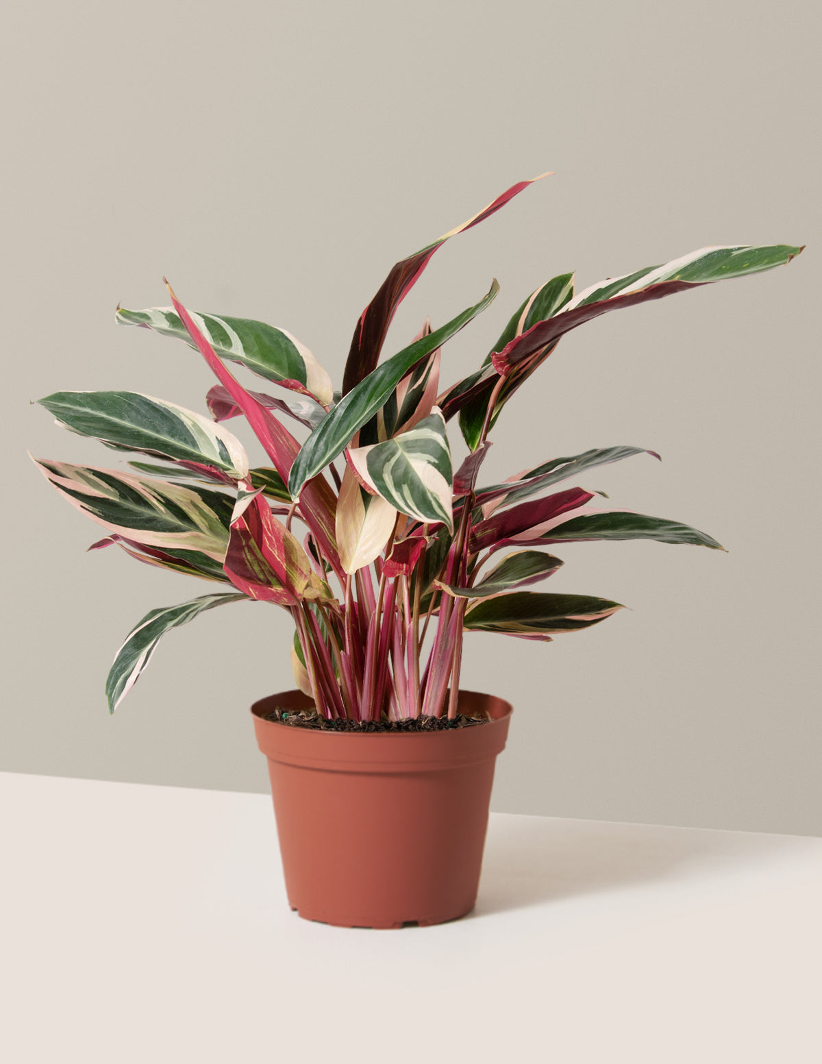 The elegant, elongated leaves of the Stromanthe Triostar are green, pink, and cream on top and magenta underneath. Help its variegation stay vibrant by placing it in a spot that receives bright indirect light. The Stromanthe is part of the same family as prayer plants (Marantaceae) and will similarly appreciate high humidity from a pebble tray or humidifier.