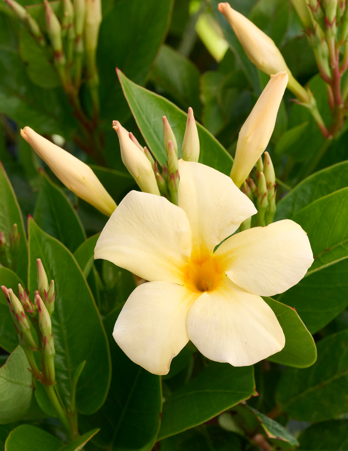 Give your Sunbeam Mandevilla full sun to part sun and well-draining soil, and watch it flourish. Water regularly but avoid soggy roots. A little fertilizer goes a long way in keeping those golden blooms coming!