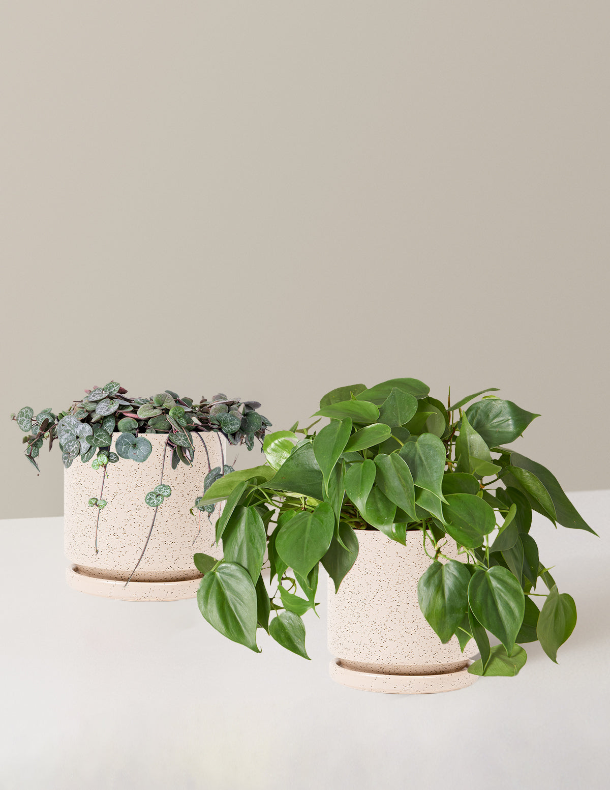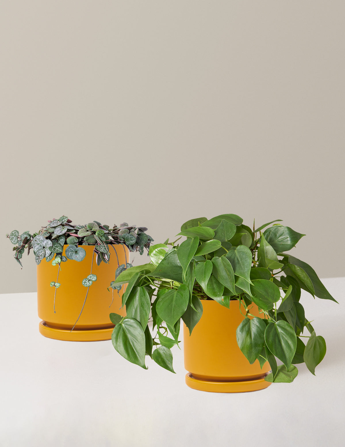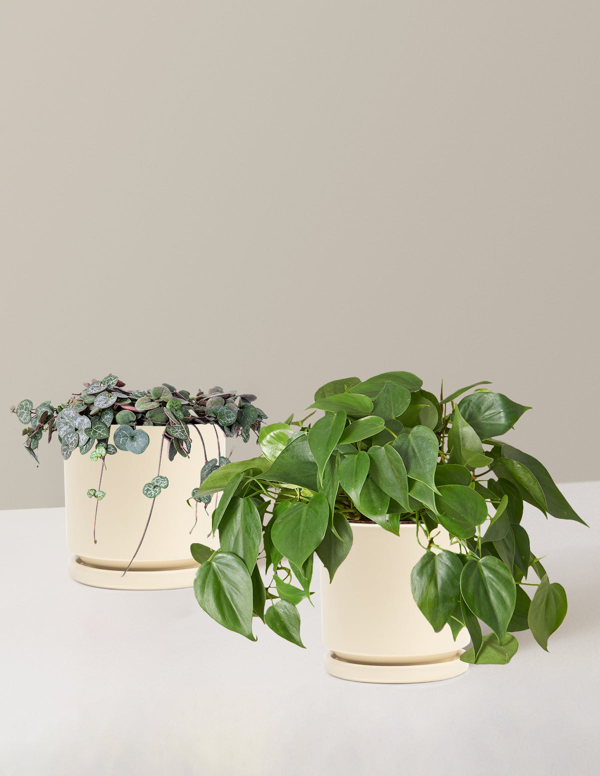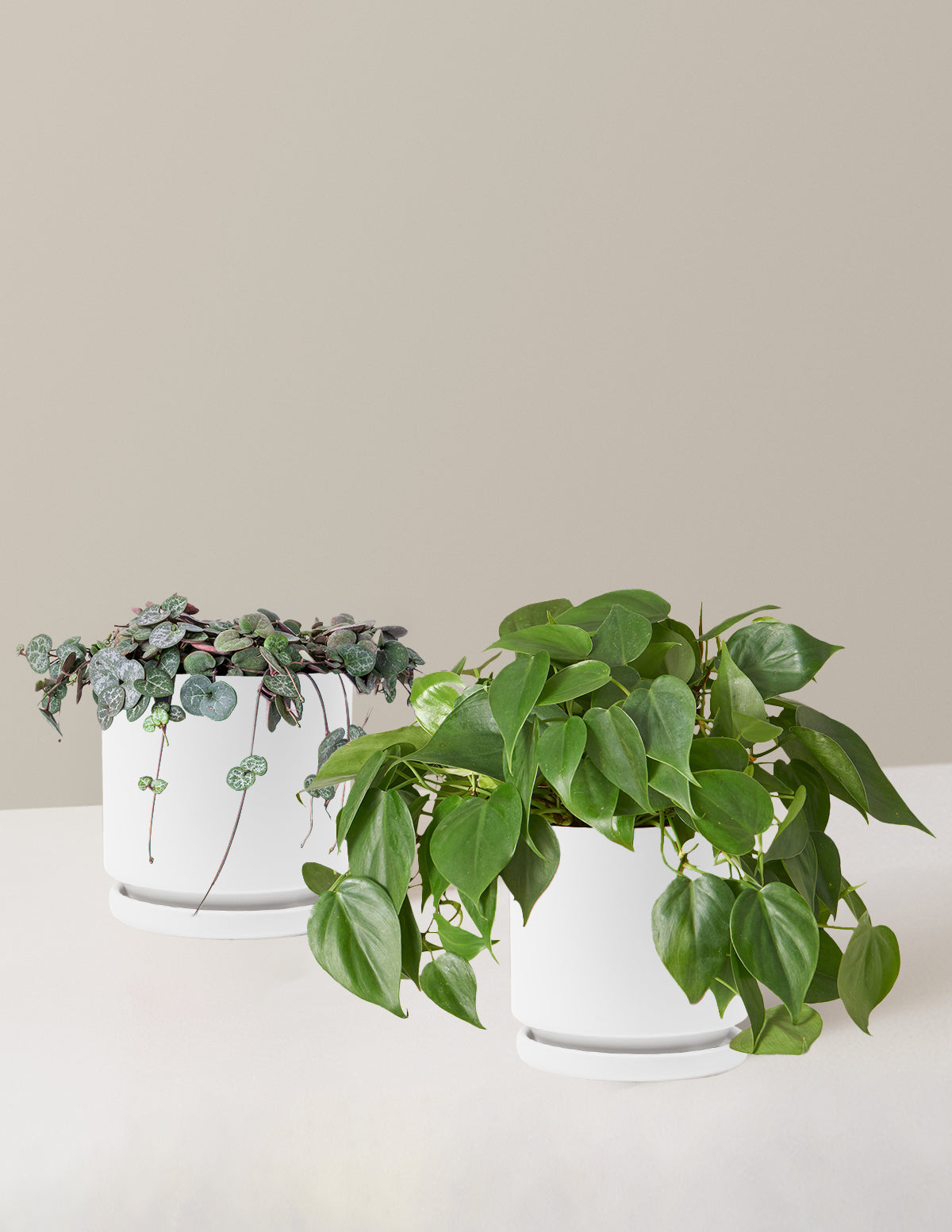 This duo features two heart-shaped favorites—String of Hearts and Heartleaf Philodendron—for a low-maintenance cascade of greenery with sweet symbolism and trailing texture.