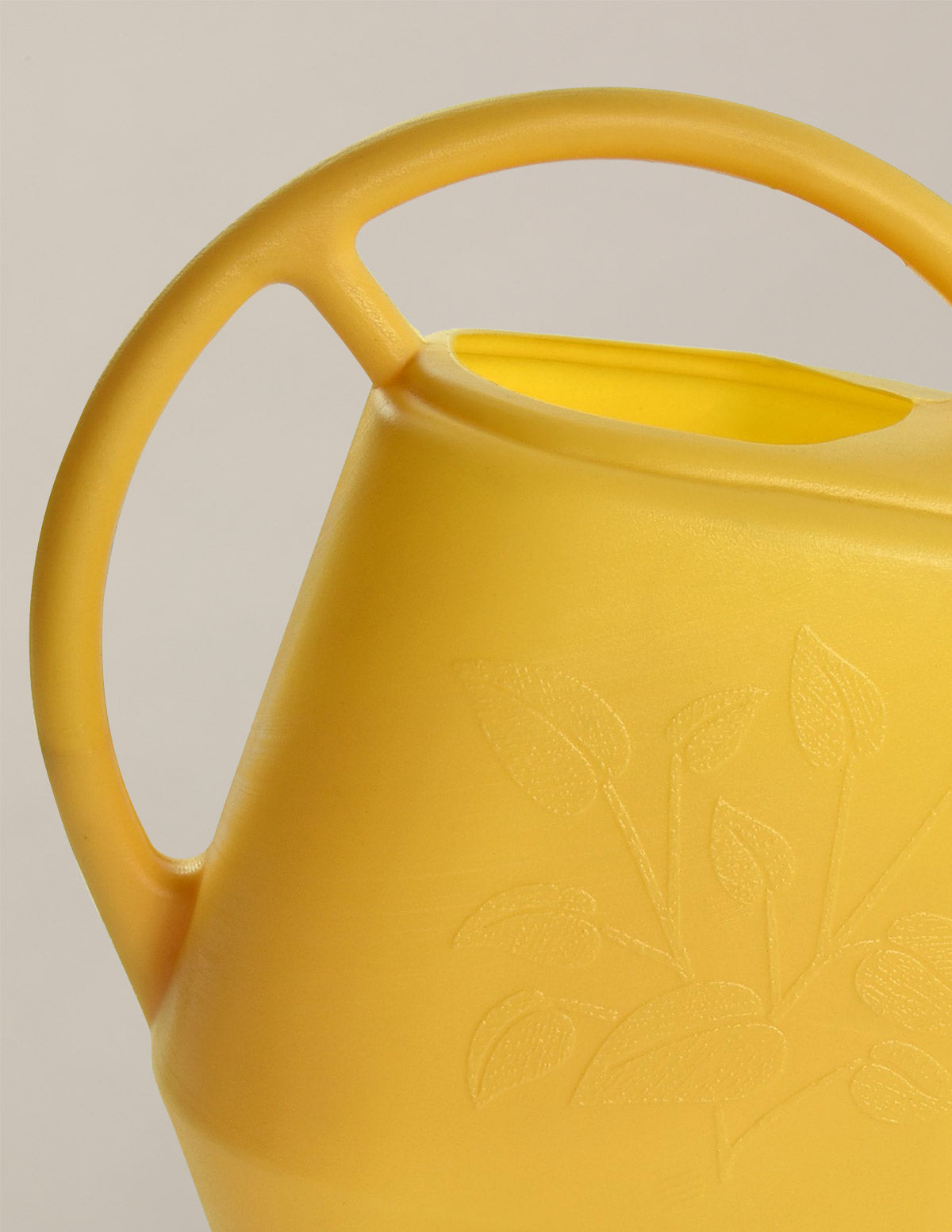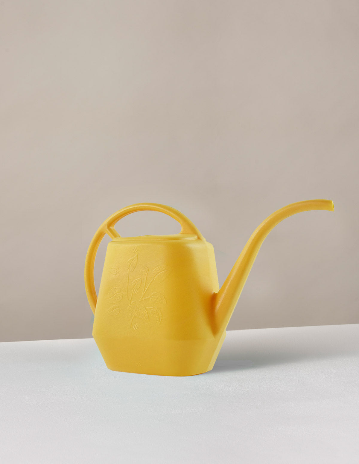 Small BPA-free plastic watering can in cheery yellow with a long stem spout to control water flow. Holds 56 oz of water (about 1/2 gallon). Great for watering indoor plants but durable enough for outdoor use as well. Embossed with a leafy plant motif. Made in the USA.