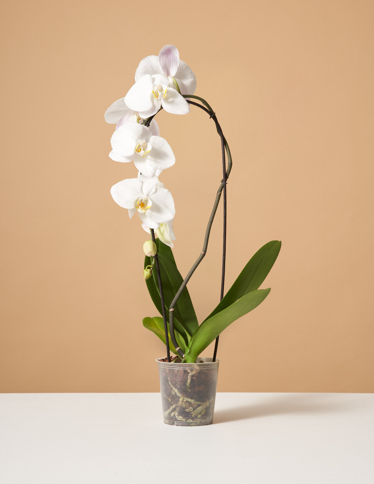 With its elegant stems and cascading white flowers, this Phalaenopsis orchid makes any space feel chicer. You may notice a small number of blooms on your orchid upon delivery. These blooms will open quicker in a warm indoor setting. The Phalaenopsis will typically bloom about once a year for up to three months. After a blooming cycle, the flowers will wilt and fall off. This is the orchid’s way to store up energy to re-bloom again next season.