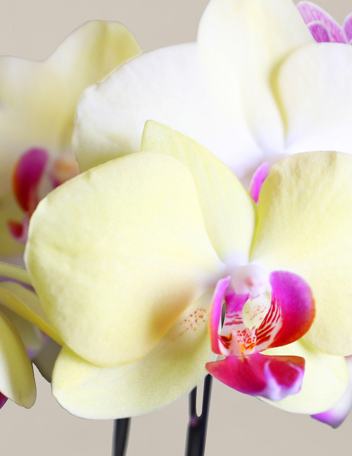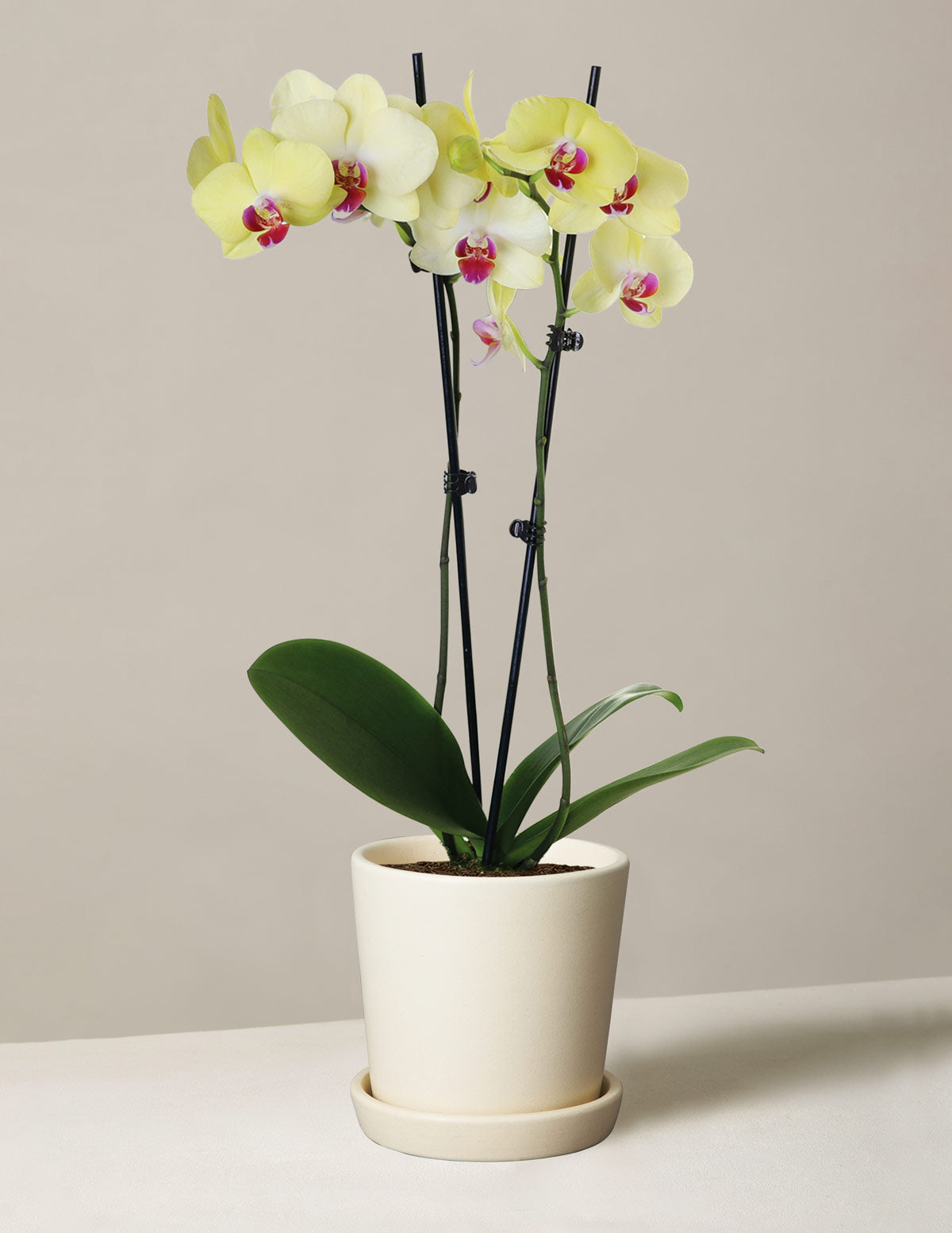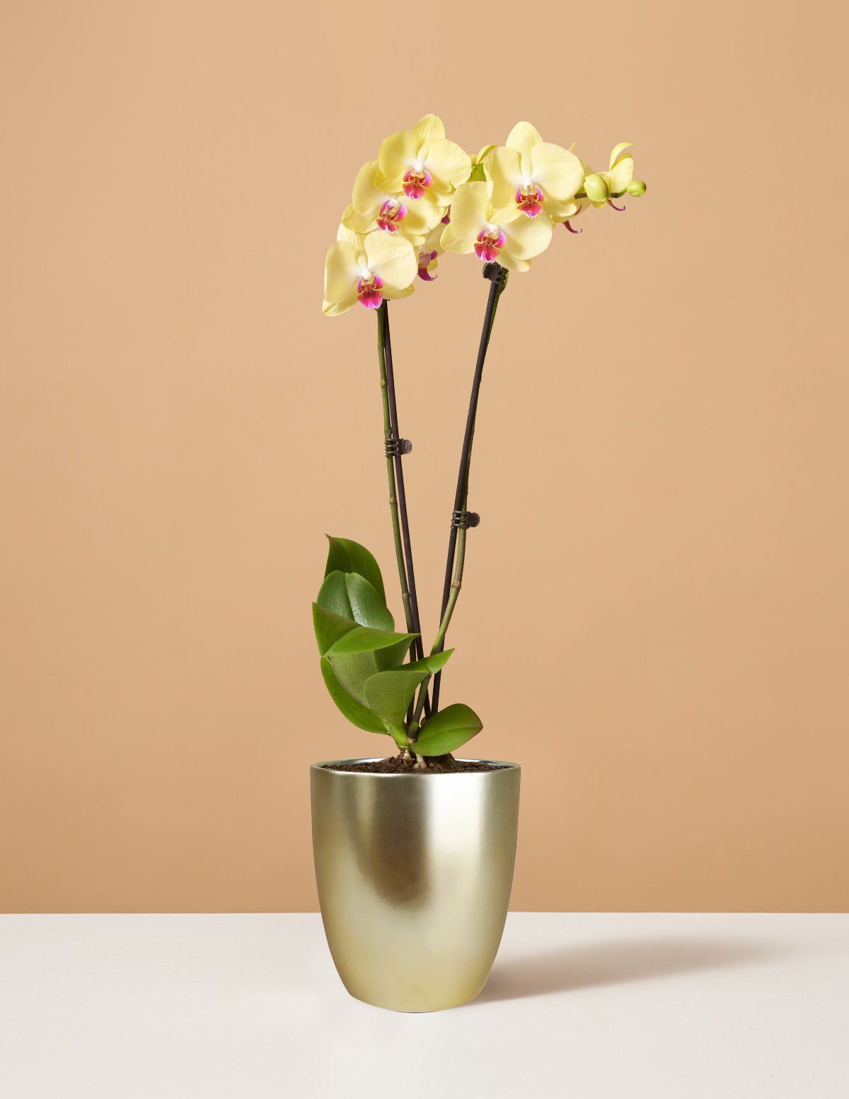 Our Yellow Orchid is sure to brighten up any space with its light yellow flowers with fun, pink centers. This is a Phalaenopsis orchid, which are also known as “beginner” orchids as they’re one of the easiest varieties to grow as a houseplant. You may notice a small number of blooms on your orchid upon delivery. These blooms will open more quickly in a warm, indoor setting. This plant will typically bloom about once a year, for up to three months at a time. After a blooming cycle, the flowers will wilt and fall off. This is the orchid’s way to store up energy to re-bloom again next season.